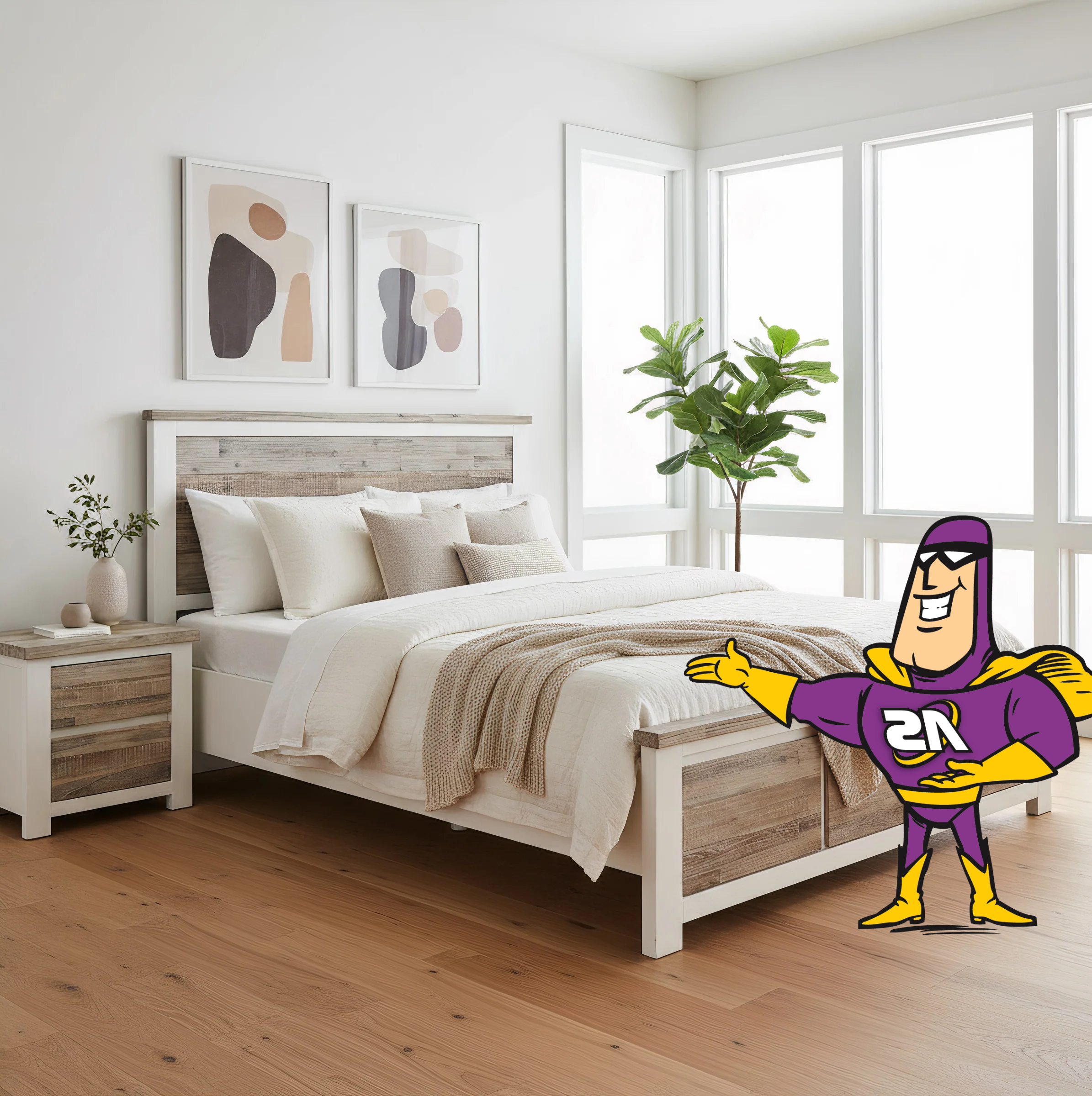 Crafted from solid Acacia timber, it’s tough, stylish, and rocking that weathered wood-and-white combo that says, “I have taste, but I also love naps.” The bed even hides three secret drawers in the footboard — perfect for your spare blankets, mismatched socks, or emergency snacks.