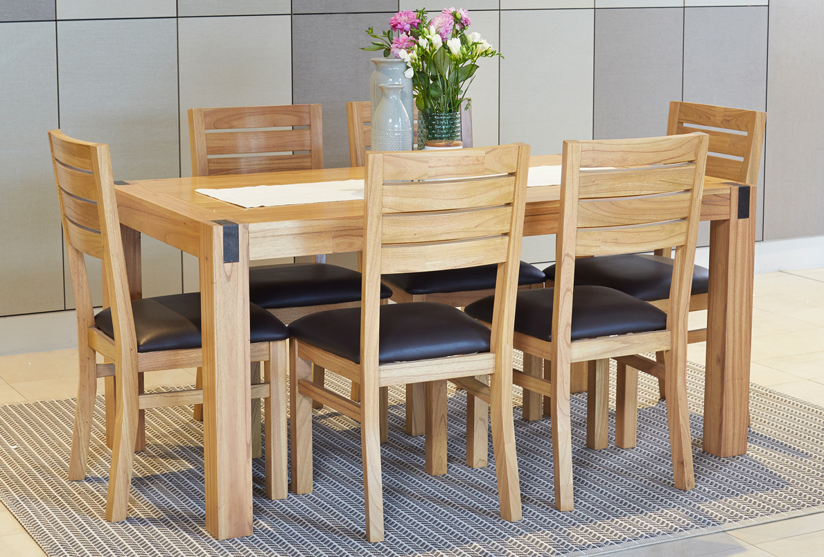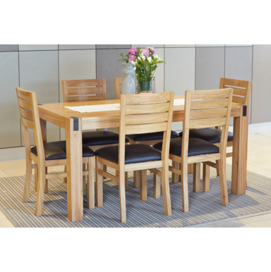 The Dundee 7 piece suite is a sturdy piece of furniture made from Natural Oak timber. The table has metal corner pieces for a slightly modern addition. The table comes with six (6) comfortably padded chairs which are also constructed from Natural Oak timber.